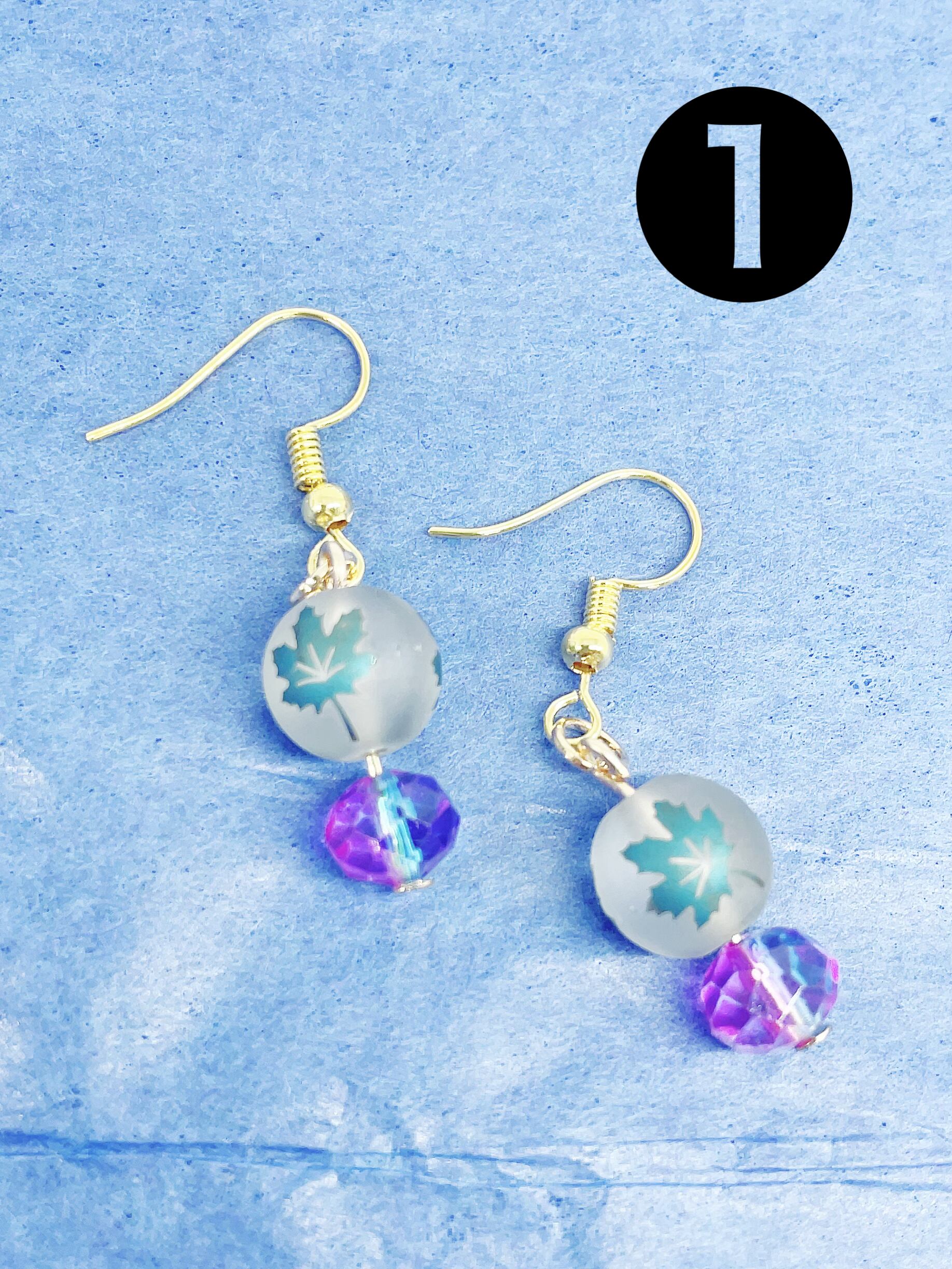 紅葉狩りにつけて行きたくなる ビーズのグラデーションと リーフ柄のガラスビーズ。 耳元に秋の訪れを感じてください。 樹脂ピアス、イヤリングに変更可能です。