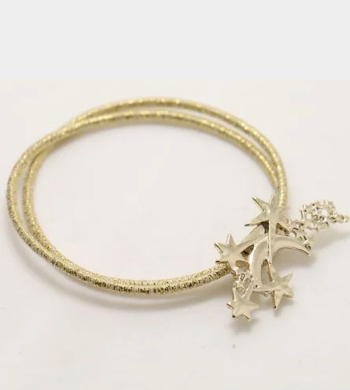 流れ星のように輝くゴールドスターのヘアゴムです。髪にアクセントをプラスし、華やかなスタイルを演出します。ヘアスタイルを一つのアクセサリーで盛り上げることができるので、おしゃれにこだわる女性にぴったりです。