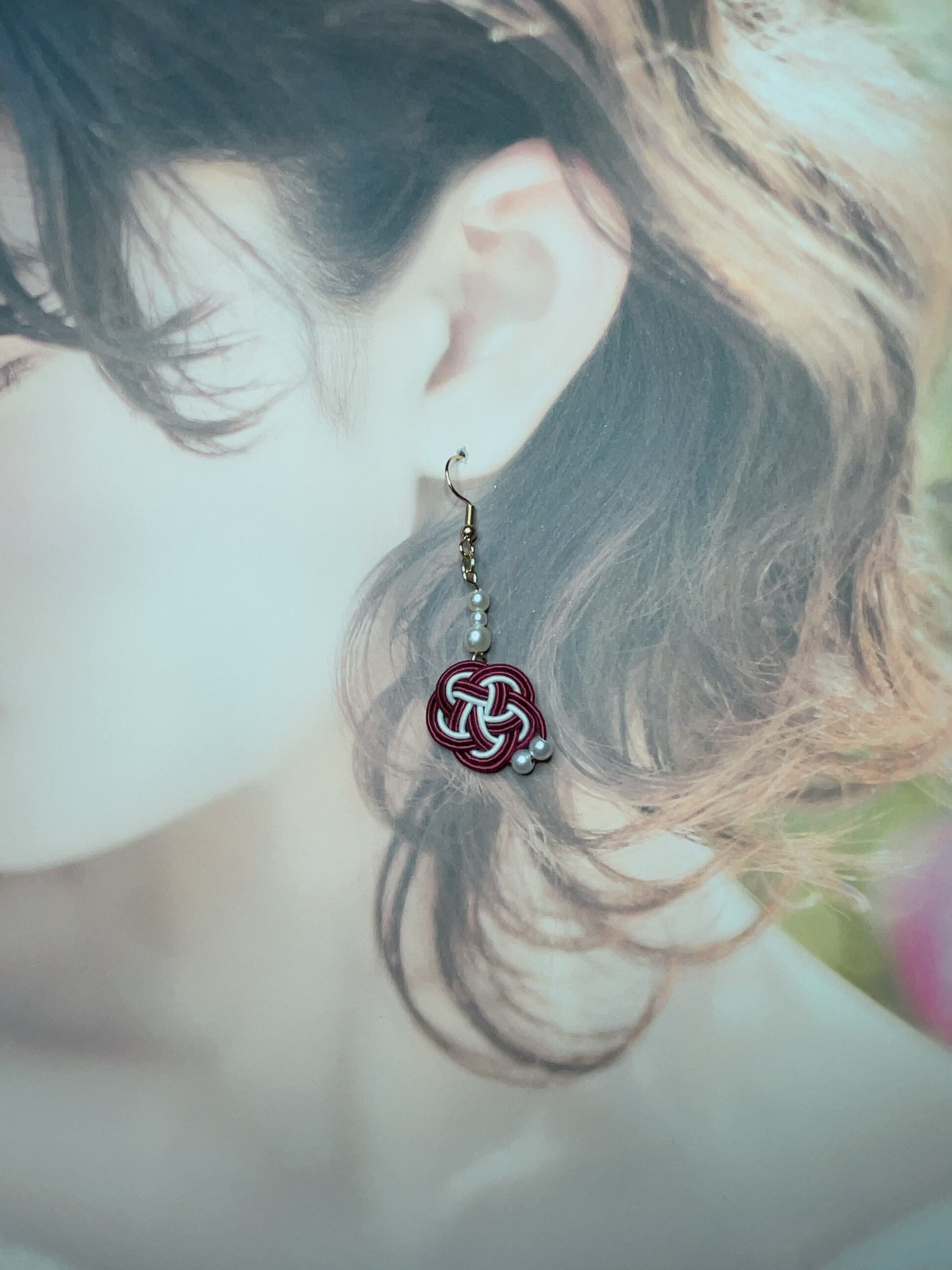 紅白の水引を使用した可愛らしいピアスです。日本の伝統的なデザインを取り入れたこのピアスは、和風のコーディネートにぴったりのアクセサリーです。