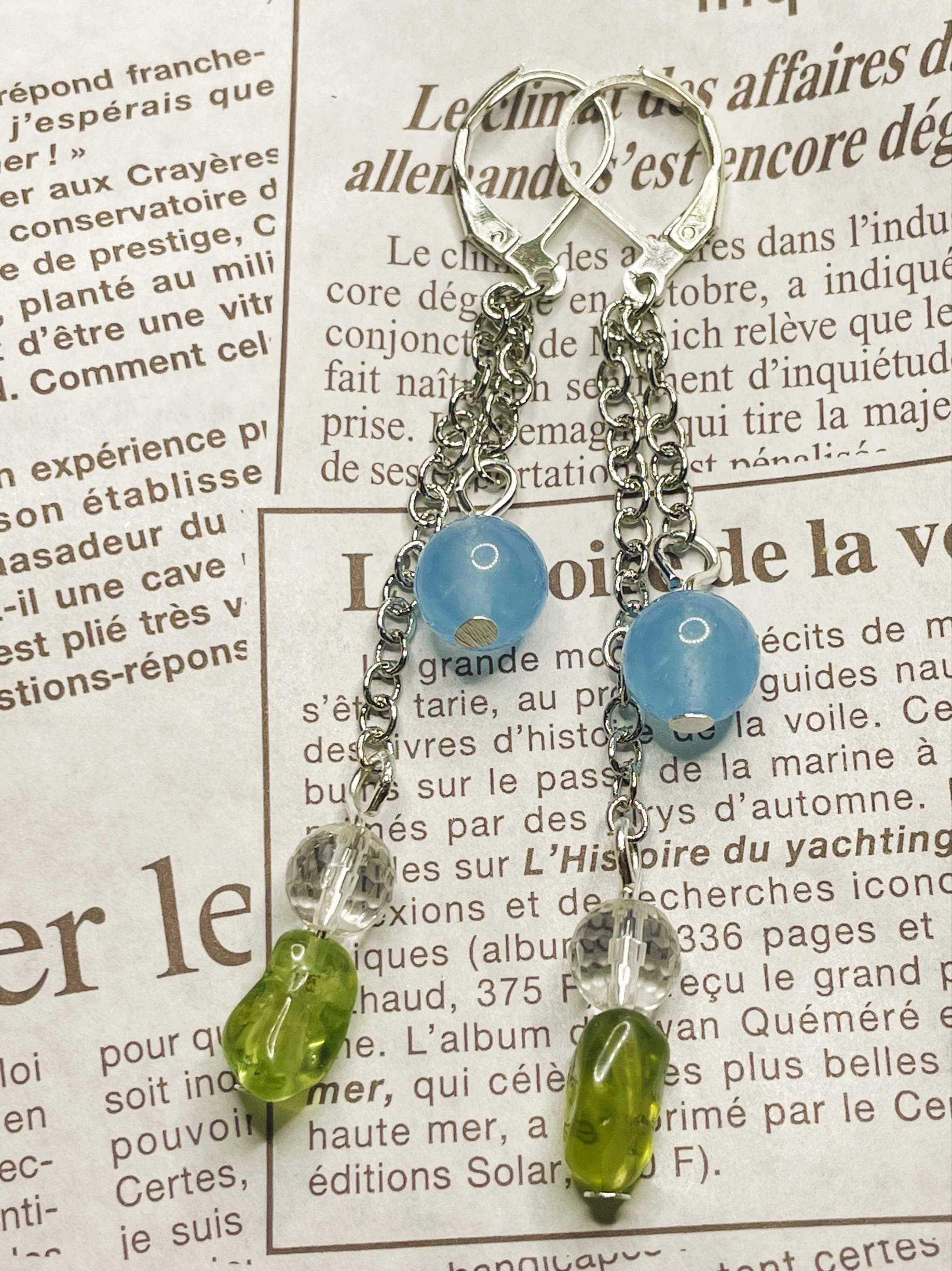 ブルーカルセドニーと水晶とペリドットの美しい色が輝くフレンチフックピアス。石の持つ力を身にまとい、自信を持って毎日を楽しんでください。丁寧に手作業で作られた逸品は、本当に一つ一つが異なる表情を持っています。耳から落ちる心配もない、安心のフレンチフック設計で、オシャレを楽しみたい方におすすめです。このピアスがあなたの日々に幸せな輝きを与えますように。今日から、あなたのイヤリングコーディネートに華を添える存在になってください。