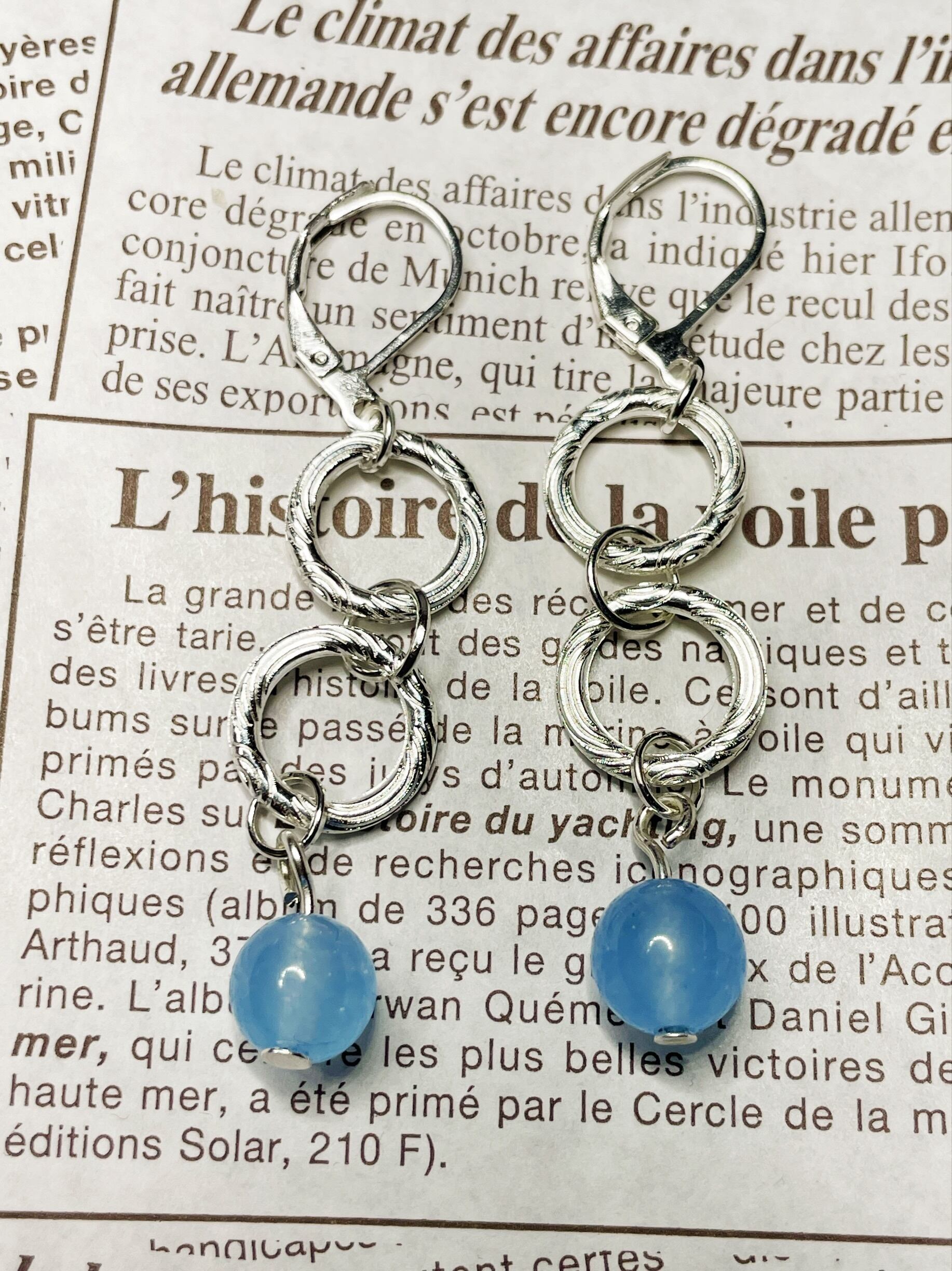 二つの輪が重なり合う存在感が際立つ、ダブルフープピアス。シルバー色のメタルフレームに、ブルーカルセドニーの美しい輝きが映えるデザインです。上品でありながらも遊び心が感じられ、どんなコーディネートにも華やかさをプラスしてくれる一品です。
