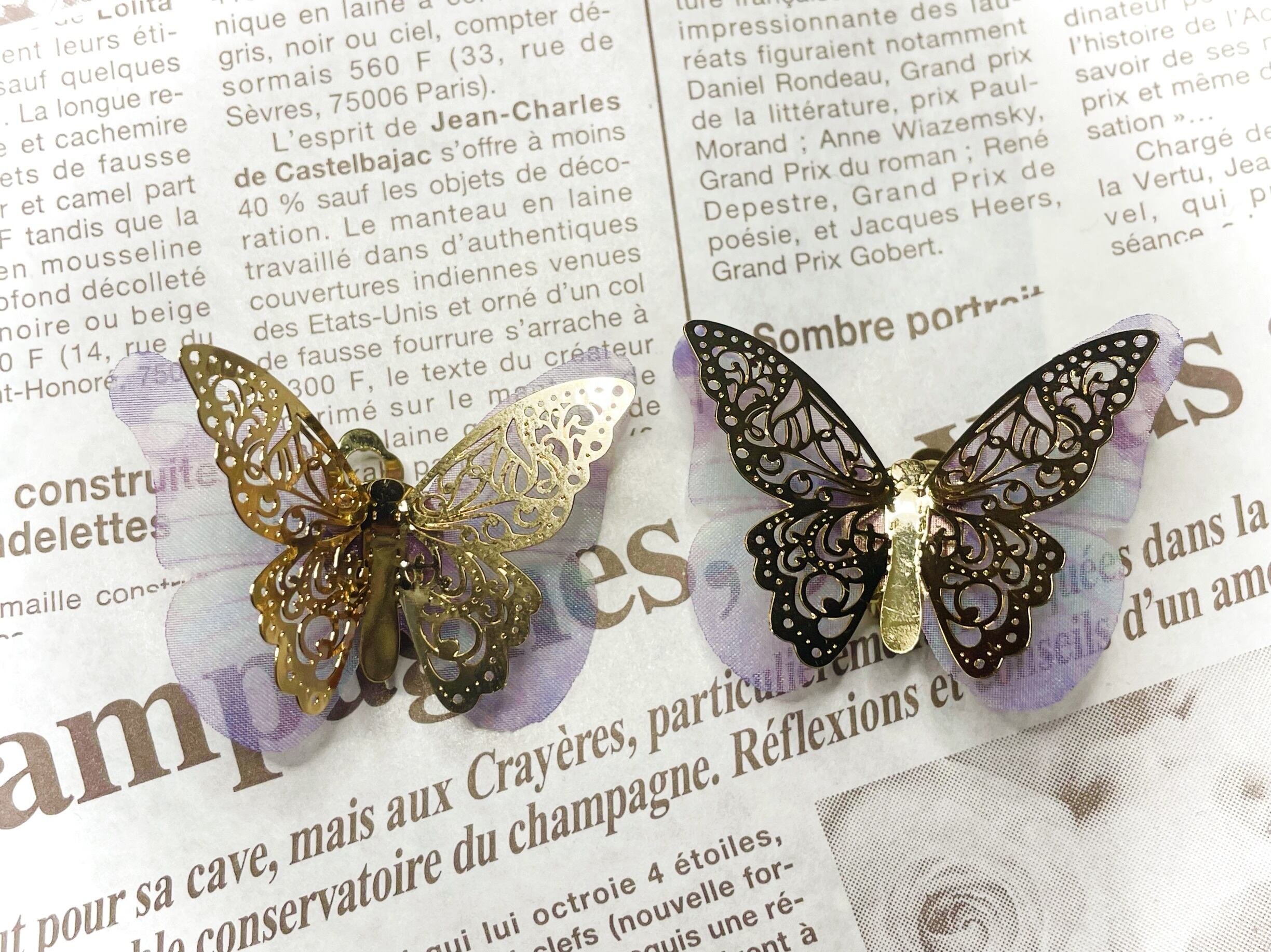 シフォンダブルバタフライイヤリングが登場です!こちらは、透かし彫りのプレートとシフォン素材の重ね付けが特徴で、繊細かつ華やかな印象を与えてくれます。バタフライのモチーフは、自由や変化を表し、あなたの個性を引き立てるアクセントになります。