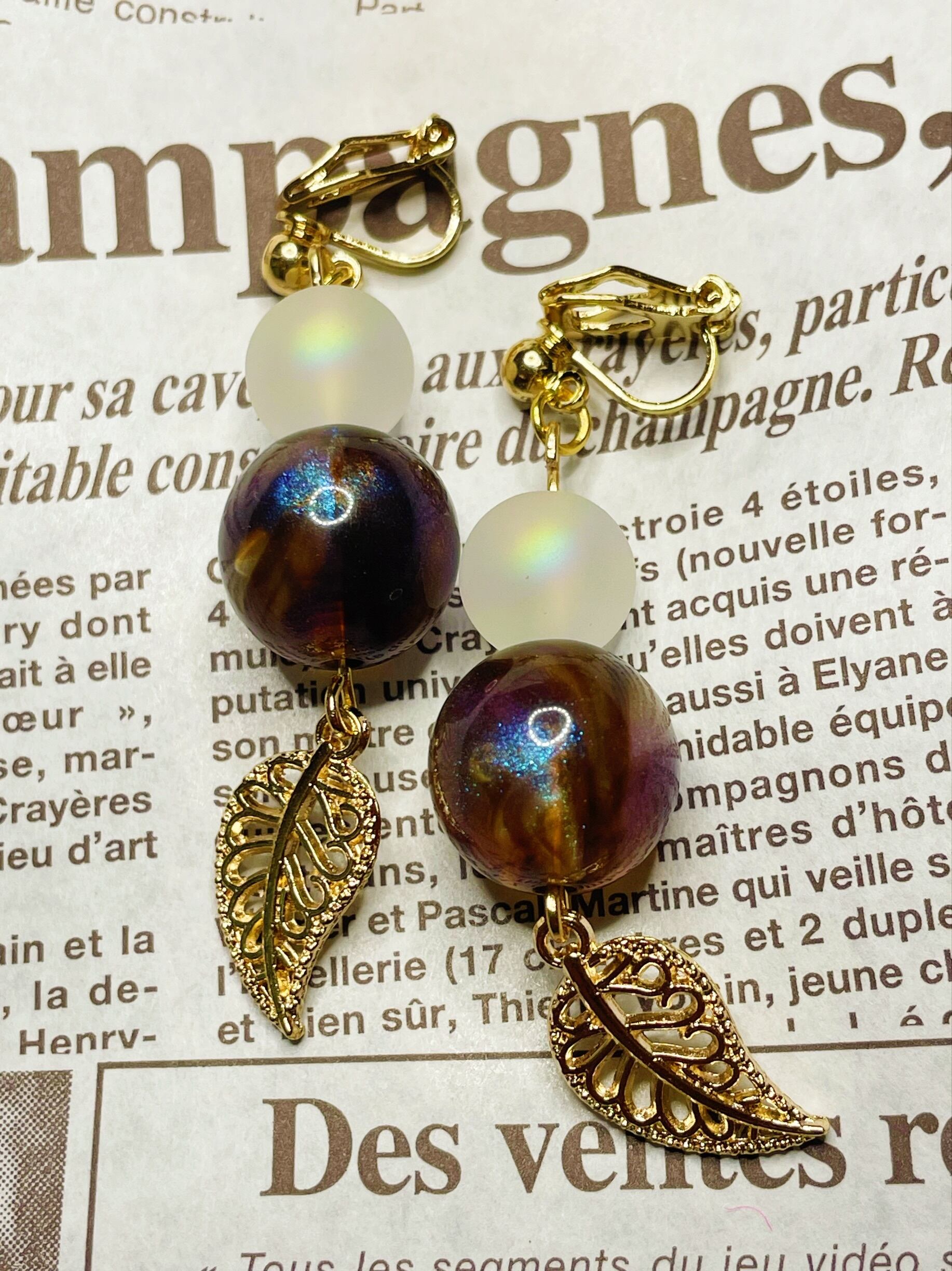 秋色のイヤリングが新登場です!秋を感じさせるブラウンのビーズとオーロラ系ビーズを使用したこのイヤリングは、耳元で揺れるリーフのチャームが特徴です。季節感あふれるカラーリングが、あなたのファッションに温かみをプラスし、華やかな印象を与えます。