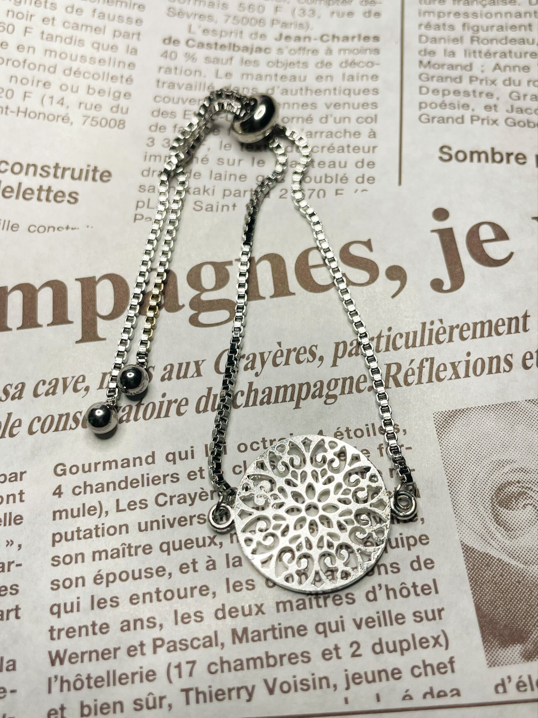 透かしチャームのブレスレットが新登場です!美しいシルバーの輝きを放つこのブレスレットは、繊細な透かしデザインが特徴で、手元にエレガントなアクセントを加えます。スライドパーツが採用されており、着脱も簡単なので、日常使いから特別なシーンまで幅広くご利用いただけます。