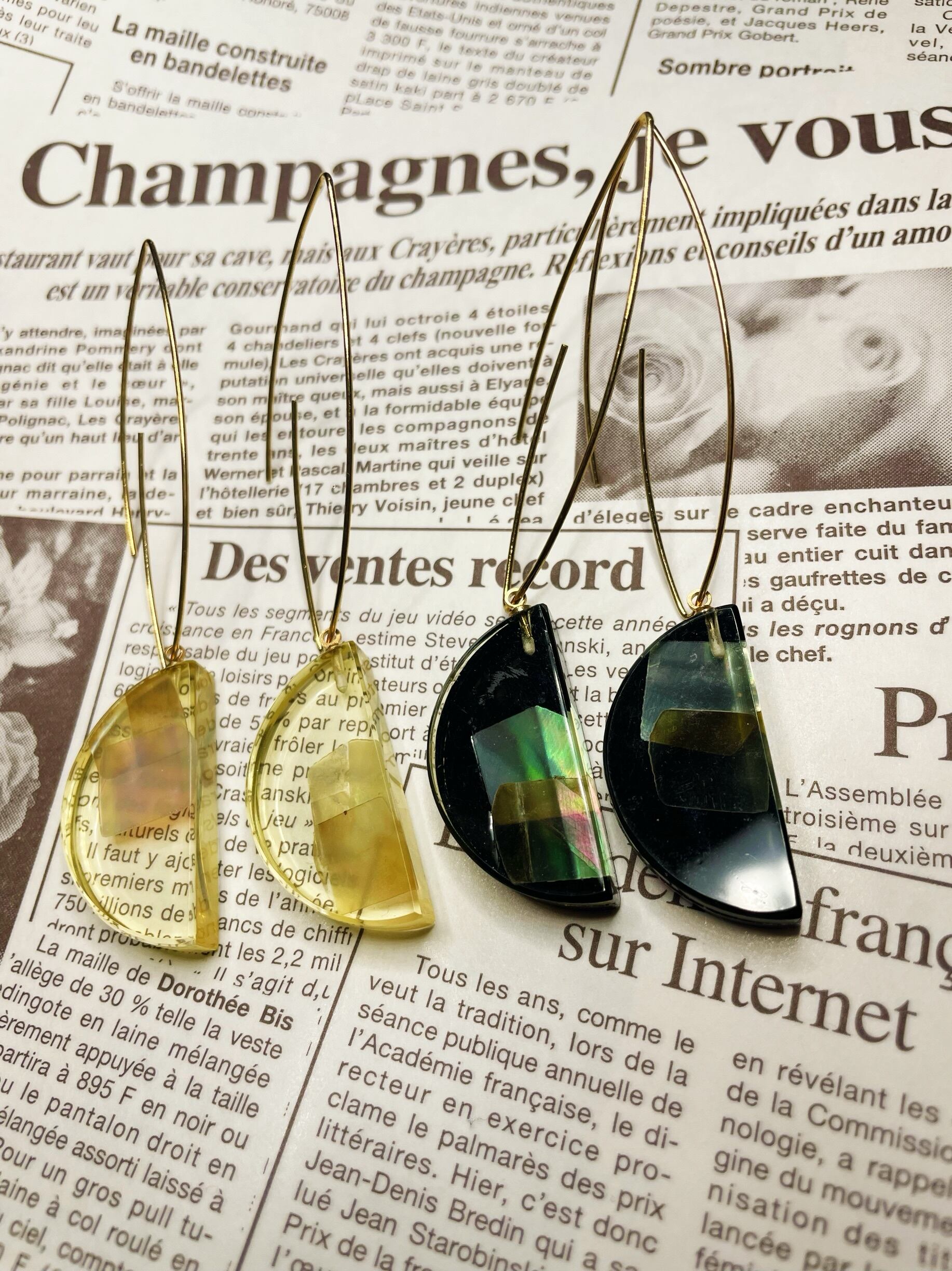 大切な方への贈り物としても最適で、特別な瞬間を美しく彩る贈り物として喜ばれることでしょう。ただし、デザインの特性上、シェルのパーツや半円の揺れ方に若干の違いが生じることがありますので、そのユニークな魅力をお楽しみいただければと思います。半型のピアス part2で、あなたの耳元に華やかさと魅力をプラスしてください!