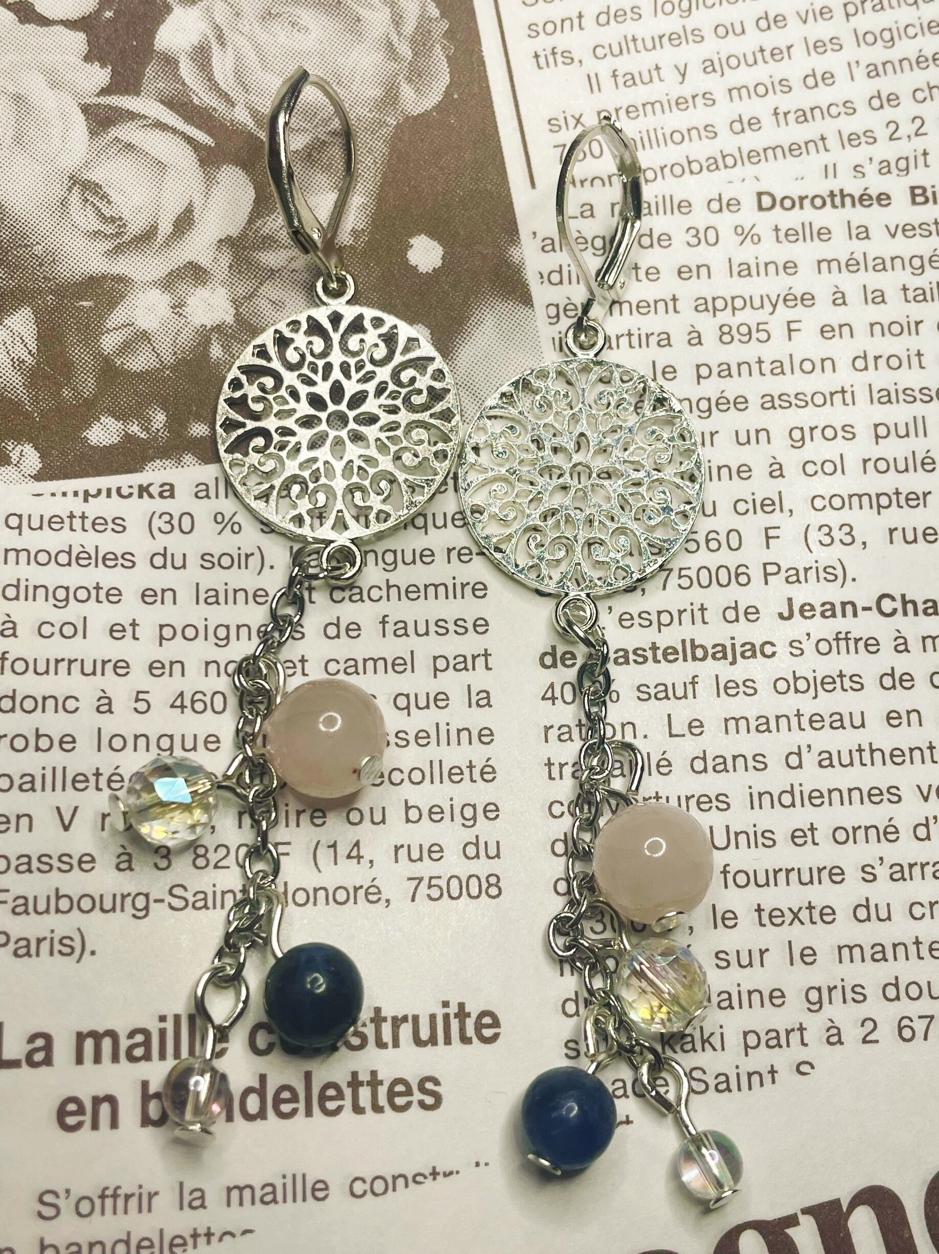 透かし彫りチャームと天然石のピアスが新登場です!シルバーカラーの透かし彫りチャームが耳元で優雅に揺れ、ローズクォーツとオーロラ水晶、ソーダライトの天然石が美しいコントラストを生み出します。このピアスは、シンプルでありながらも特別な存在感を持ち、日常使いはもちろん、特別なシーンでも幅広くお楽しみいただけるアイテムです。